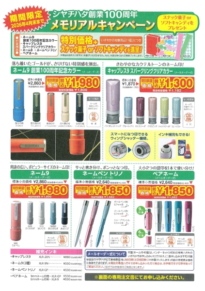 シャチハタ 創業100周年メモリアルキャンペーン2026 毎年恒例のシャチハタキャンペーン★期間限定2026年... 2026.2.13 -
