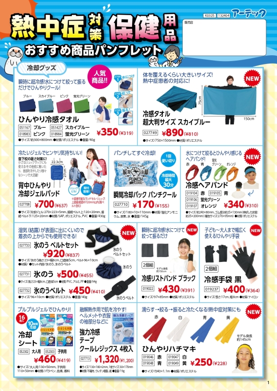 ◎冷却グッズ◎屋外用品◎熱中症計◎空気環境の管理・扇風機◎絆創膏・ガーゼ・包帯◎シーツ◎感染対策◎除菌アルコール◎スプレー容器◎ペーパータオル◎石鹸◎健康管理・健康診断用品